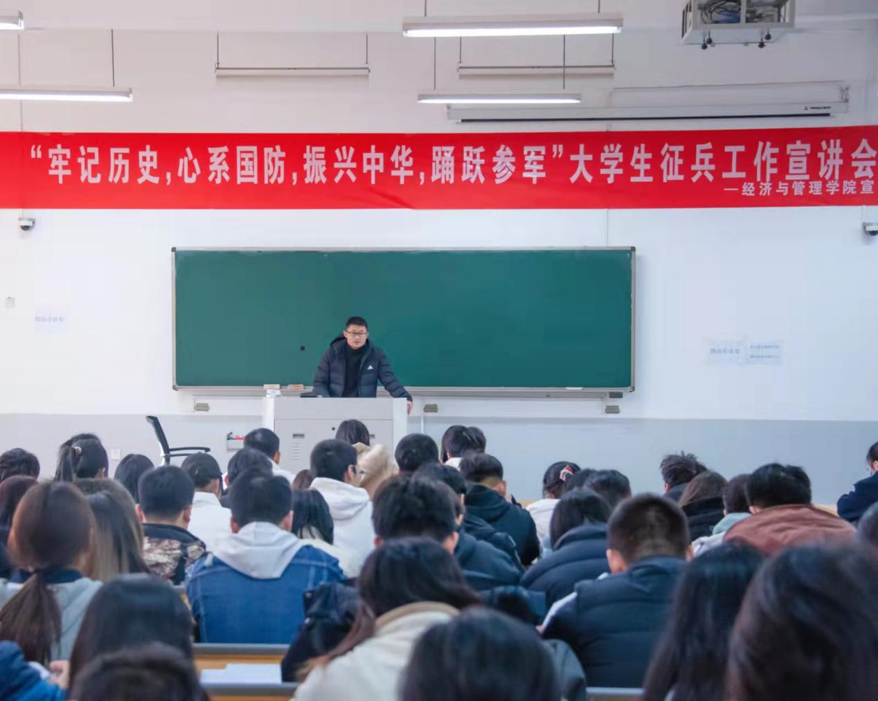 近期的征兵宣传活动。最后,余老师结合大学生在校期间应征入伍的具体事例为大家进行更进一步的宣讲,明确阐释了大学生参军入伍的意义,鼓励学生响应国家号召,积极报名,应征入伍。