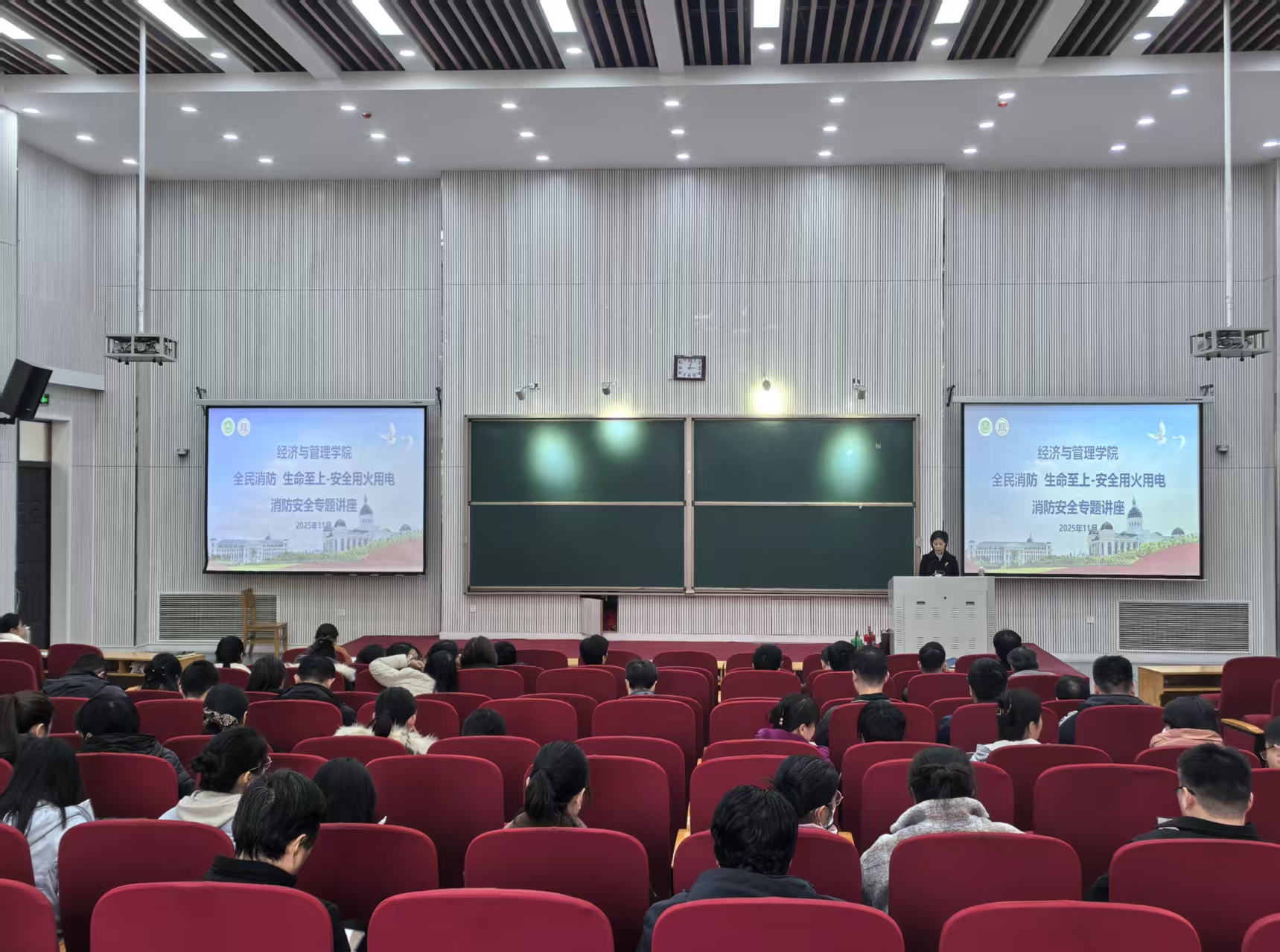 于11月25日举办“全民消防,生命至上——安全用火用电”消防安全专题讲座。讲座由副院长赵友平主持,全体教职工参会。