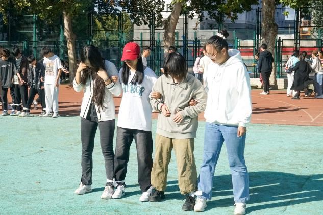 从起点到终点,路途艰辛,总会有些磕磕绊绊,只有步调一致,才能顺利进行。同学们团结一致,肩并肩,齐迈步,信任中透着一种会心,含着一种默契。