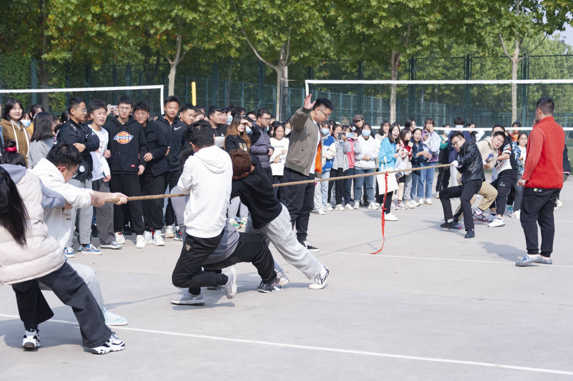 赛场上,队员们双手紧握长绳,团结一心,拉开“弓字步”,凝神聚气,一触即发。只听裁判一声哨响,各个队员紧握绳索,身子稍往后倾,咬紧牙关,使尽全身力气将绳索往各自队伍方向拉拽。随着红色锤线的左右移动,啦啦队的心也随之迁动拍打着手势,为场上队员加油鼓劲,气势丝毫不逊于参赛队员,现场呐喊声、加油助威声此起彼伏,现场紧张热烈的气氛将整个比赛推到了高潮。最后,经过各班同学的奋力比拼,经济类21-5班获得一等奖,经济类21-3班获得二等奖,经济类21-1班获得三等奖。