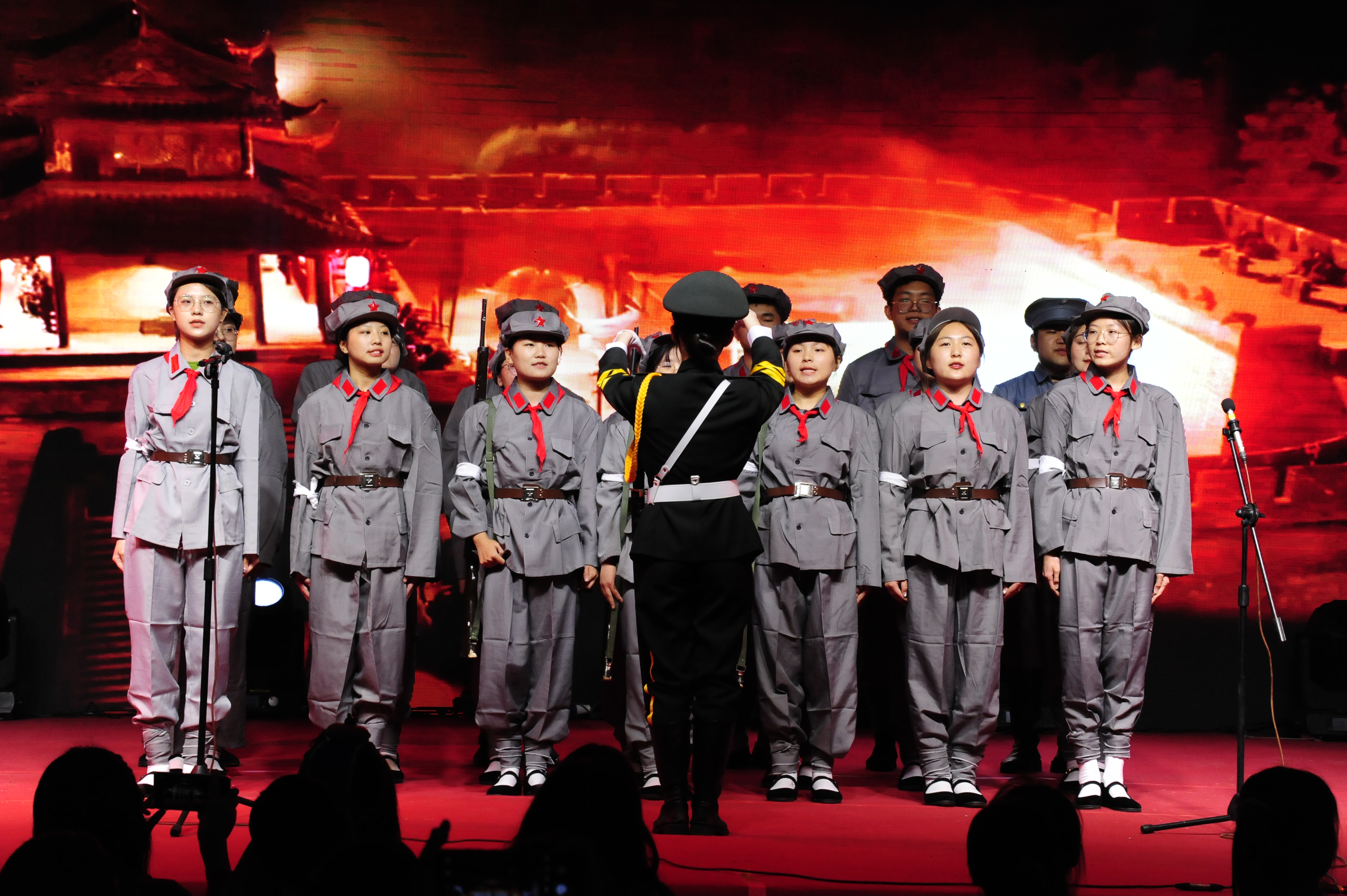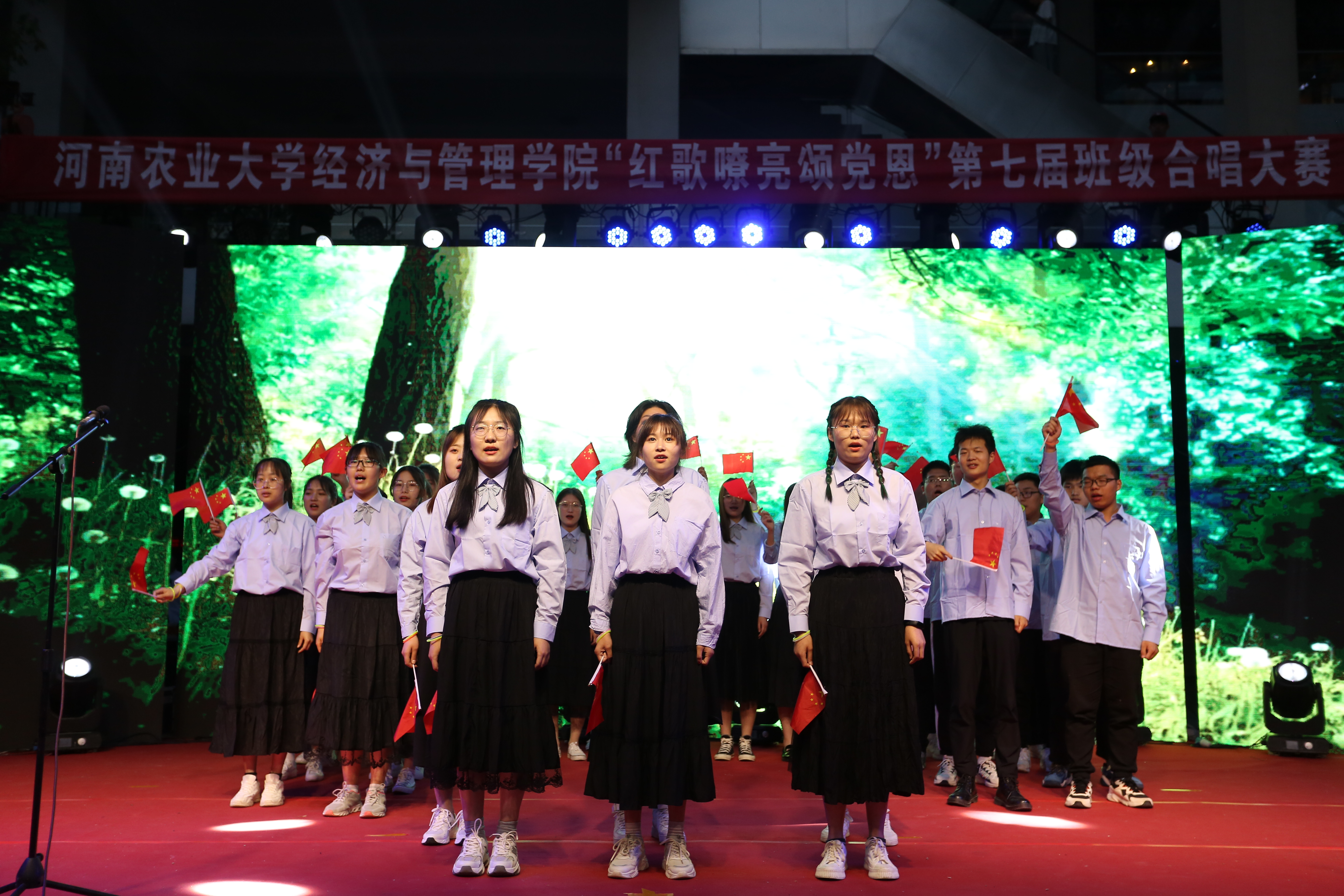比赛期间,台上的同学们热情洋溢,声音洪亮;指挥员手势准确,富有激情;台下观众掌声不断,一次次将比赛推向高潮。一首《党,永在我心》红歌的精神让经管学子时刻铭记建党之初那段激情燃烧的岁月,彰显了中华儿女对中国共产党的崇高礼赞;一首《流光溢彩日,党旗正红时》嘹亮的歌声唤起了青年学子慷慨报国的凌云壮志;熟悉的《乘风破浪吧!青年》《做自己,也做你的光》、耳熟能详的《唱响新时代的青春赞歌》尽情抒发了在中国共产党领导下青年学生团结一心推进社会主义建设事业的无限豪情。一幕幕演出盛况,青年学生用歌声抒发对中国共产党的崇敬和赞扬;用歌声歌颂祖国和人民;用歌声唱出对美好生活的热爱与向往,展现着青年一代的担当和责任。