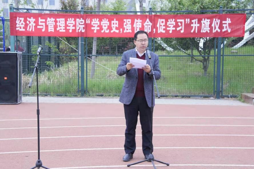 院党委书记牛青杨在国旗下发表讲话。对如何学党史、提高认识、自觉提高专业本领,提出三点希望和要求。第一:以史明志,在传承红色精神中坚定理想信念;第二:以史为鉴,旗帜鲜明反对历史虚无主义;第三:以史明今,做到知行合一,不断增强使命担当。牛书记激励广大师生以更加昂扬的姿态建功新时代,奋斗新征程,以优异的成绩迎接建党100周年。