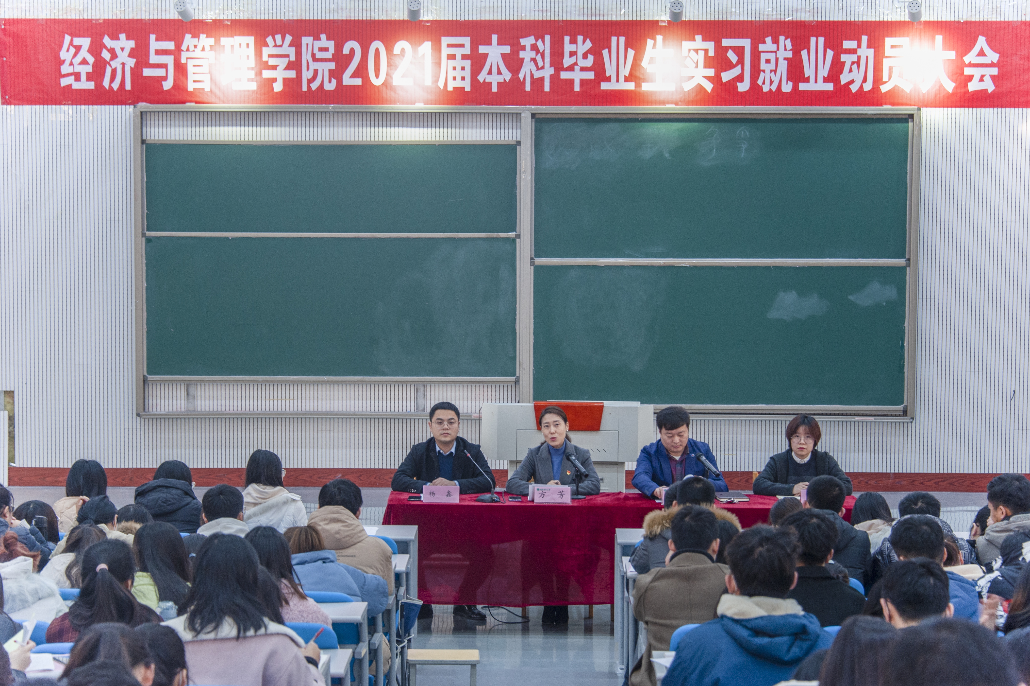 为了推进2021届毕业生实习就业工作,指导学生毕业实习,引导正确就业观念,增强学生就业主动性,12月10日,麻豆做爱 2021届本科毕业生毕业实习就业动员大会于繁塔楼大教室二举行。学院党委副书记方芳、副院长刘瑞峰、17级院团委副书记杨鑫、教学干事李广瑜出席。学院2021届全体毕业生参加此次动员大会。本次动员大会由杨鑫主持。