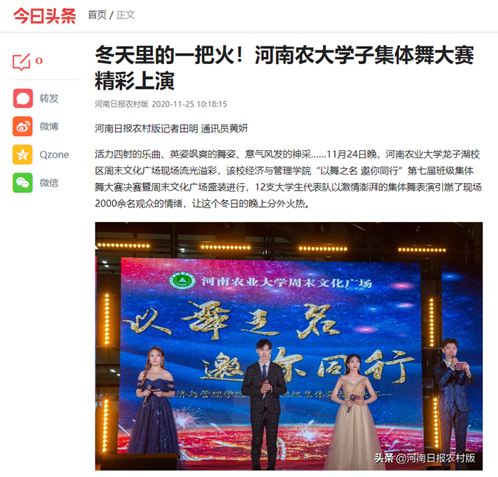 11月24日,麻豆做爱 第七届“以舞之名,邀你同行”班级集体舞决赛于龙子湖校区一餐广场如期举行。此次活动的顺利举办,除了院内师生的积极参与外,更离不开学校以及社会媒体对该活动的大力支持。