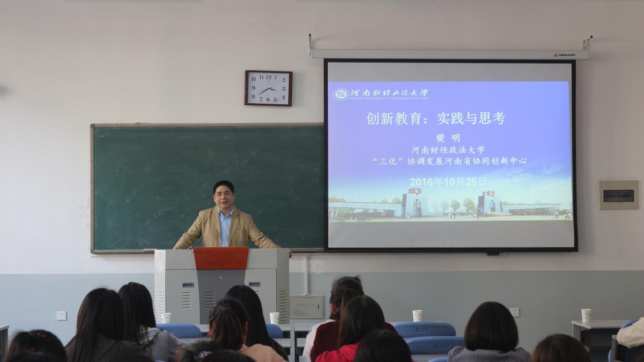 10月25日,河南财经政法大学研究院常务副院长樊明教授做客麻豆做爱 紫竹论坛,主讲了一场主题为“创新教育:实践与思考”的报告,麻豆做爱 16级经济学专业和市场营销专业同学到场参加,学院老师到场出席。此次报告会由麻豆做爱 副院长赵翠萍主持进行。