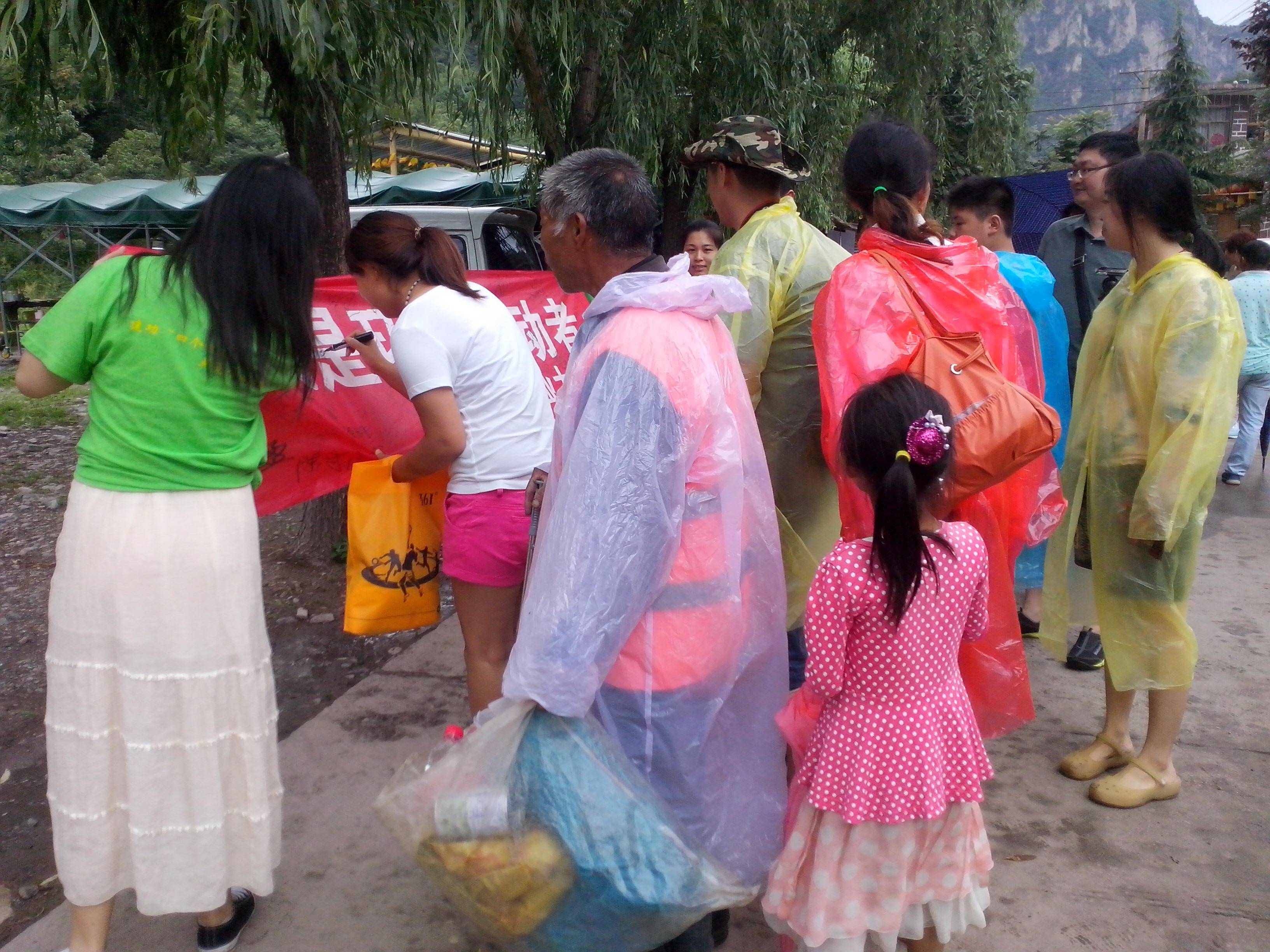 7月6日是实践的最后一天,几个女孩来到村中挂起了条幅。一张条幅,表达的是她们的心愿,她们对环保事业的支持。除了河南老乡,还来自全国各地的游客,更有来自韩国的友人前来签名。一个签名,融汇的是他们对美丽地球的祝愿。虽然下着雨,但是蒙蒙细雨挡不住她们支持环保的热情;哗哗阵雨,阻不了她们对环保事业的坚持。支持环保,她们在路上。新乡平原晚报对她们此次社会实践更是做出了报道“五个女学生,自费‘劝’环保”。今天她们将环保的种子种在了郭亮村,只待来年花开。