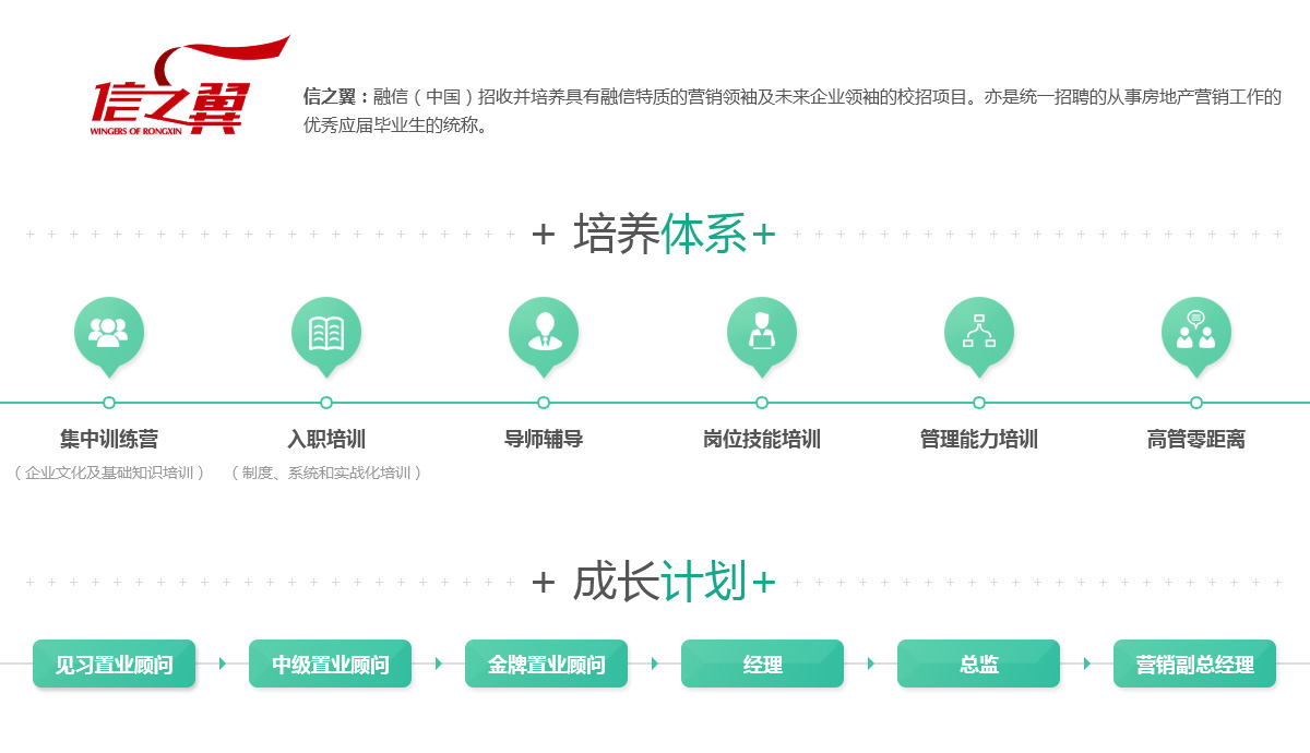 信之翼:融信(中国)招收并培养具有融信特质的营销领袖及未来企业领袖的校招项目,亦是统一招聘的从事房地产营销工作的优秀应届毕业生的统称。
